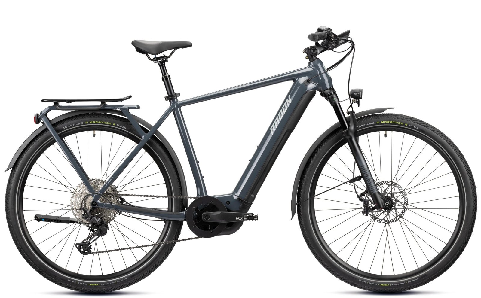 Aber der Reihe nach: den Antrieb übernimmt der Bosch Performance CX Motor der neuesten Generation inklusive Smart System. Mit seinen gewaltigen 85Nm Drehmoment und bis zu 340% Tretunterstützung bringt Dich der CX spielend überall hin, mit den vier Fahrmodi bestimmst Du die Geschwindigkeit und kannst selbst den längsten Anstieg in vollen Zügen genießen. Und der kann durchaus eine ganze Weile andauern, denn die große 750Wh Powertube Batterie bringt viel Kapazität mit, um bei großer Entdeckerlust auch noch den nächsten Gipfel mitzunehmen. Alle erdenklichen Eck- und Leistungsdaten kannst Du dem Kiox 300 Display entnehmen, was zentral vor Dir neben dem Vorbau thront und bestens ablesbar ist. Der top moderne, hydrogeformte Aluminiumrahmen mit im Unterrohr integriertem Akku bildet das Grundgerüst für unser modernstes E-Trekking Bike. Der angeschweißte Gepäckträger fügt sich formschön ins elegante Erscheinungsbild ein und nimmt gegebenenfalls auch ordentlich Zuladung mit an Bord, wenn’s länger auf Tour geht. Mit der Rock Shox Recon Gold sorgen wir auch in dieser Saison für ein vollkommen sicheres und komfortables Fahrgefühl in jeder Fahrsituation. Dank der großzügig dimensionierten 100mm Federweg sowie den voluminösen Schwalbe Marathon E-Plus Reifen bügelst Du jede Unebenheit weg und kannst entspannt dahingleiten. Sollte doch mal abrupt eine Überraschung hinter der Kurve lauern, kein Problem: mit der bissigen und gut dosierbaren Shimano XT Bremse verzögerst Du ohne mit der Wimper zu zucken. Um das edle Gesamtpaket zu komplettieren, haben unsere Produktmanager mit der Shimano XT 12-fach Schaltung den Liebling aller Radfreunde gespect, um auch beim Antrieb keine Kompromisse einzugehen und auch auf lange Sicht knackige Gangwechsel zu garantieren. Anderswo teures Extra, bei uns Serie: ein ergonomisches Cockpit mit Natural Fit All Terrain Griffen, Busch & Müller Lichtanlage und variablem Cockpit. Chapeau, das RELATE wartet auf Dich!